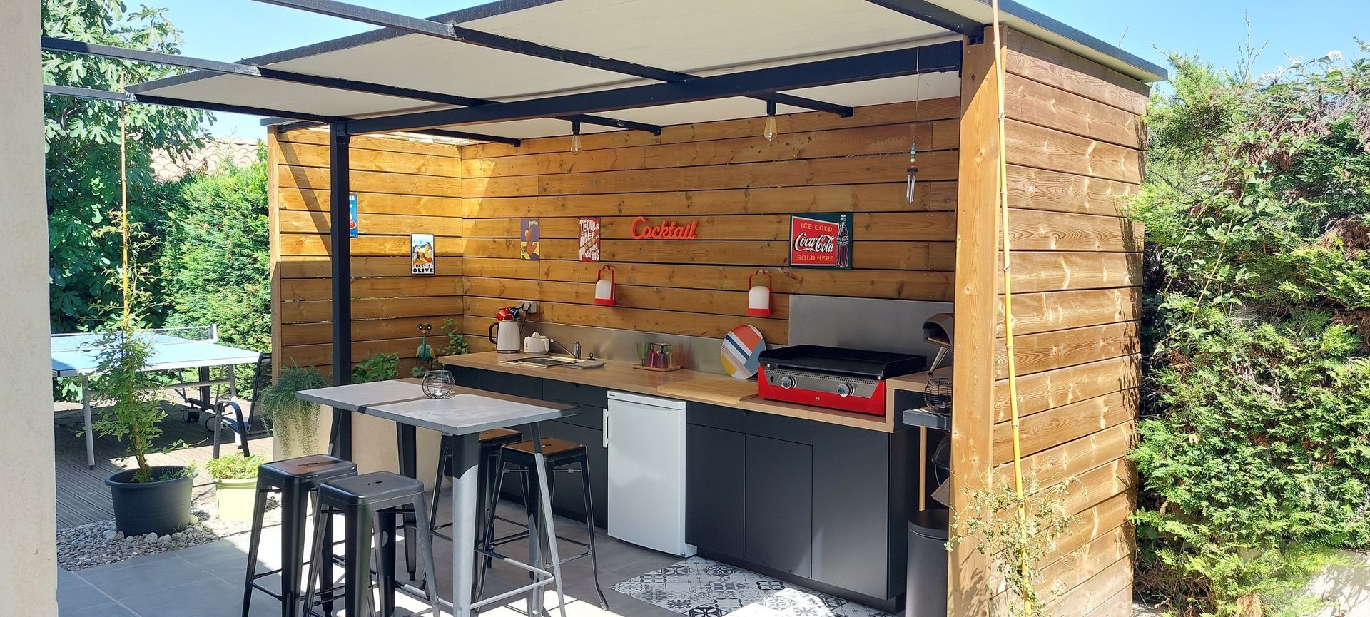 Création autour de la piscine d’un espace salon/réception avec vue vers le mont Aurélien.