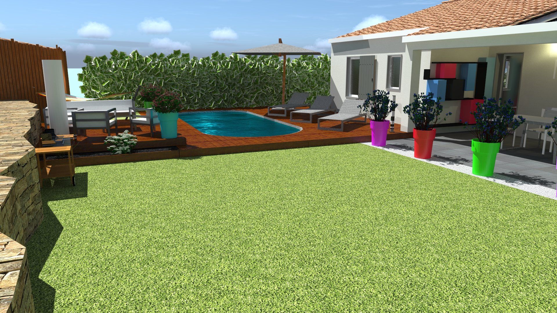 Aménagement extérieur jardin sud avec réalisation d’une piscine.